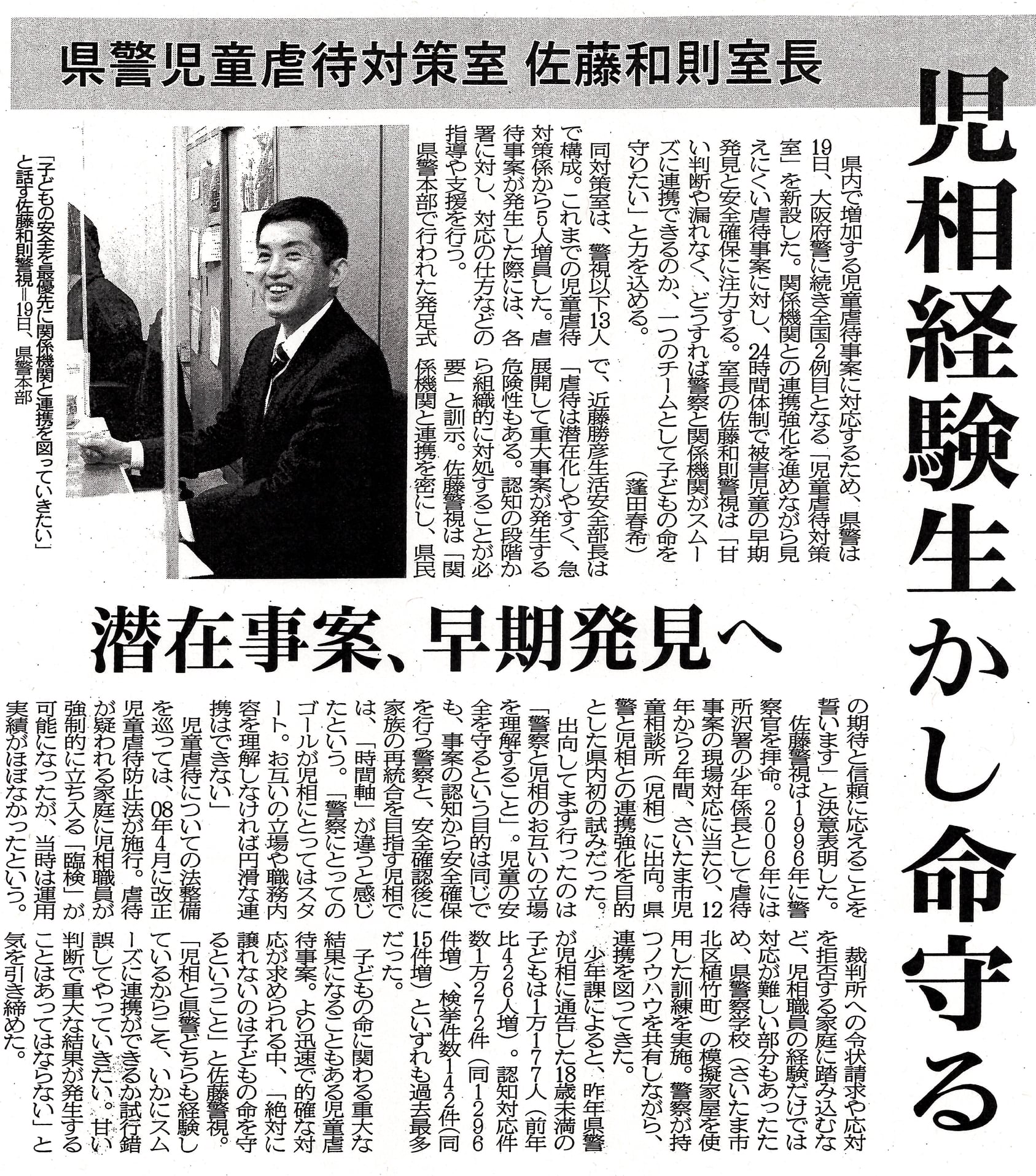 《解説:各警察署で、虐待に対処する女性警察官は昼夜おります。しかし、児童相談所で虐待対策にあたる際に同行する警察OBが女性なら、親御さんに受け止めてもらえる部分が増えると思うし、女性職員の多い児童相談所の調整も比較的しやすいと思います。埼玉県警察官の総数は、総務省で決められてしまいますが》