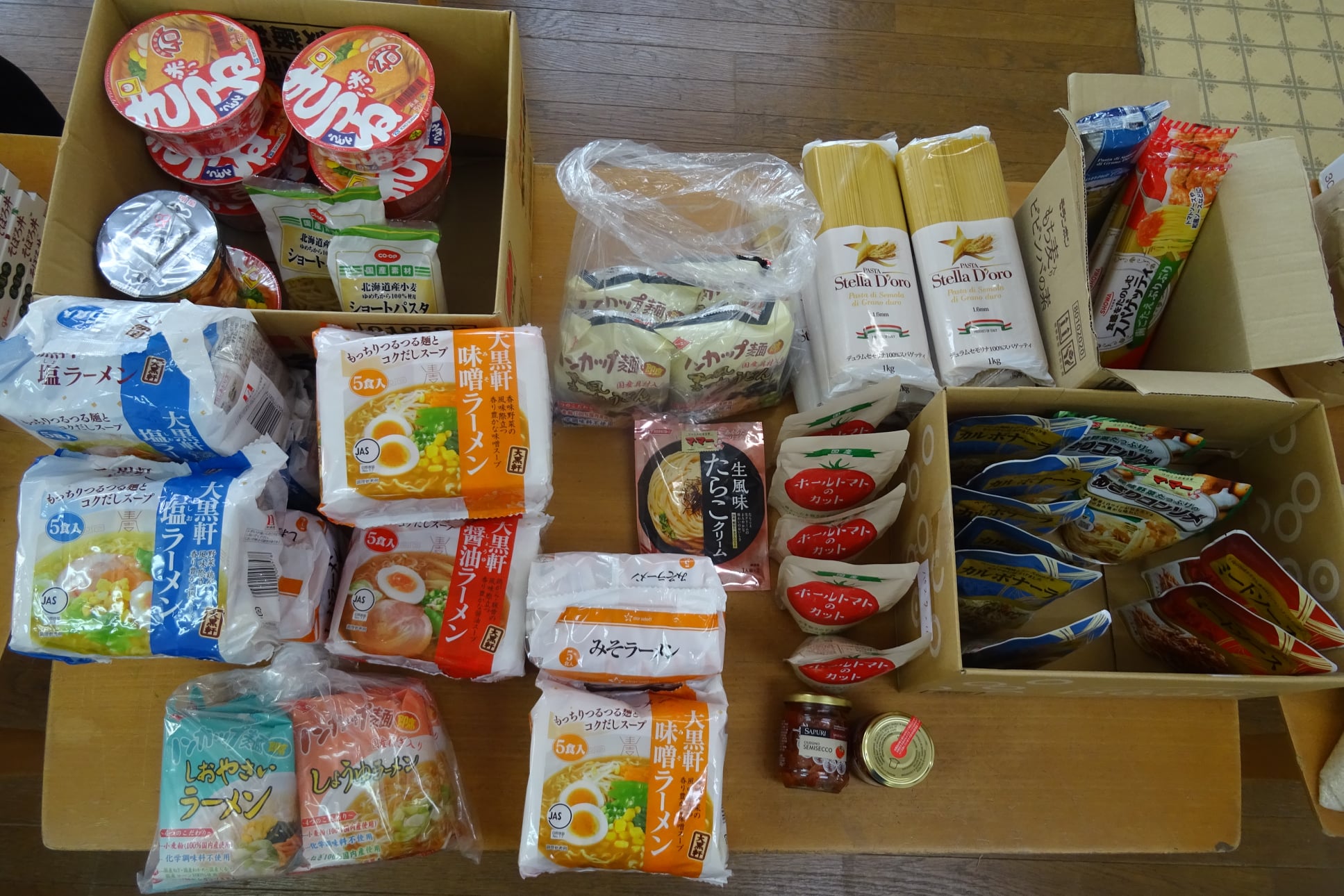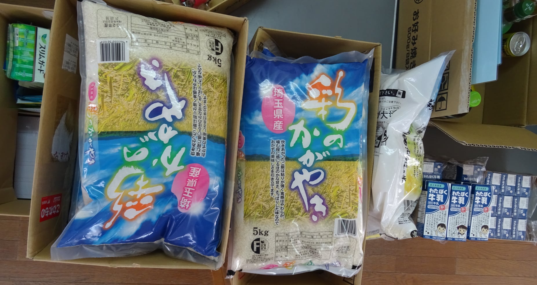 埼玉県産『彩のかがやき🍙』の他、🐄牛乳で5月まで長期保存可能なものを頂き、生理用品もあります。