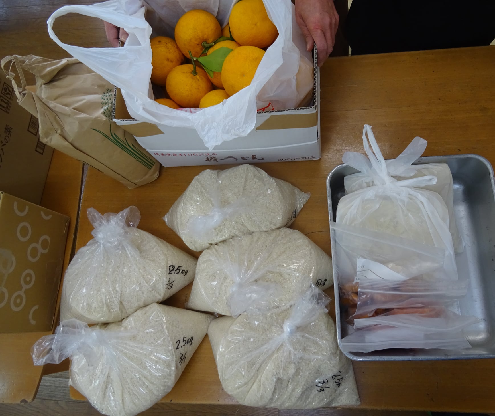 お米は、子どもの人数や、前回配布した残量を聞いて、お渡しする量を変えています。