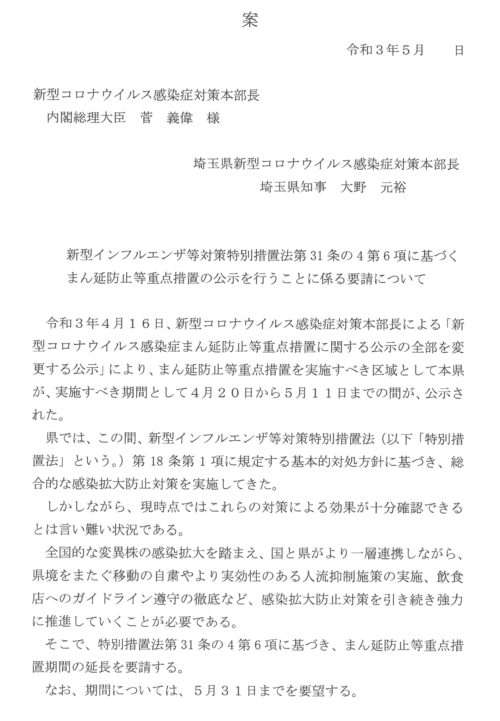 GW中の人出は、昨年4月の緊急事態宣言下と比べ 特に昼間、減らなかった。一部のデパートは‘’都内から来た‘’という情報もあるが、思ったほど大型商業施設は混み合わなかったので、深刻な状況になった訳ではないけれども、人の流れを抑えたい。”埼玉県にとどまった”という話も今日あった」。