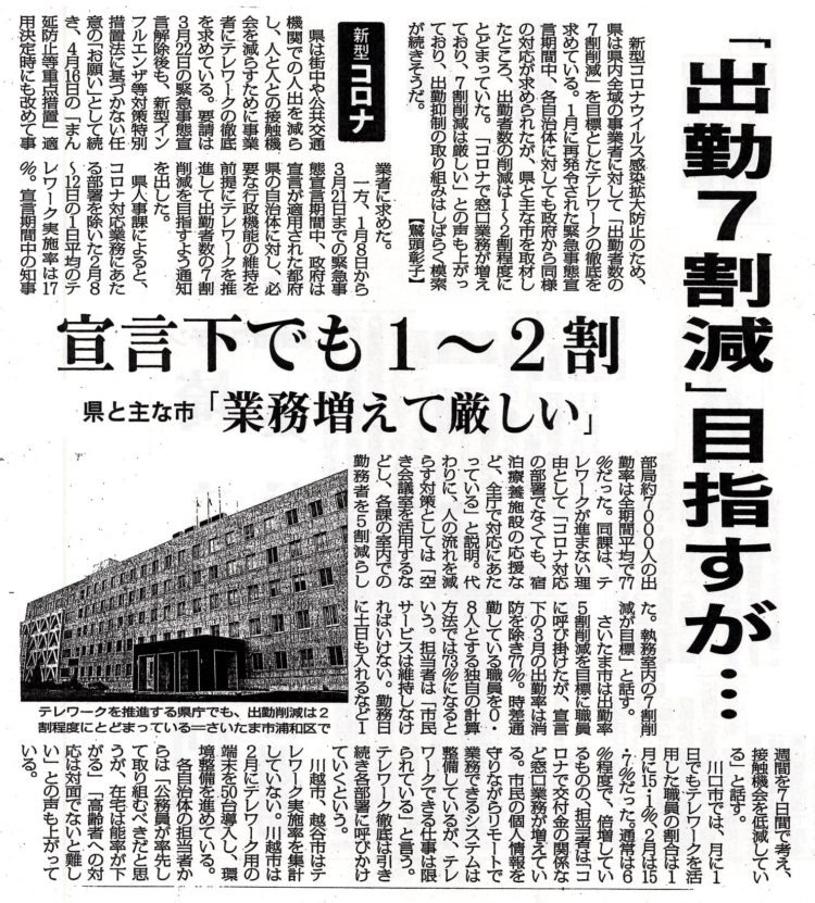 テレワーク 県庁 実施17% 部屋を増やしての対応52%(それも緊急事態宣言下の2月時点の数字で、コロナ対策担当を除いて なので、現時点はもっと悪化していると思われ、調査していない)。「県庁としては、県民サービスを落とせない」と言う。