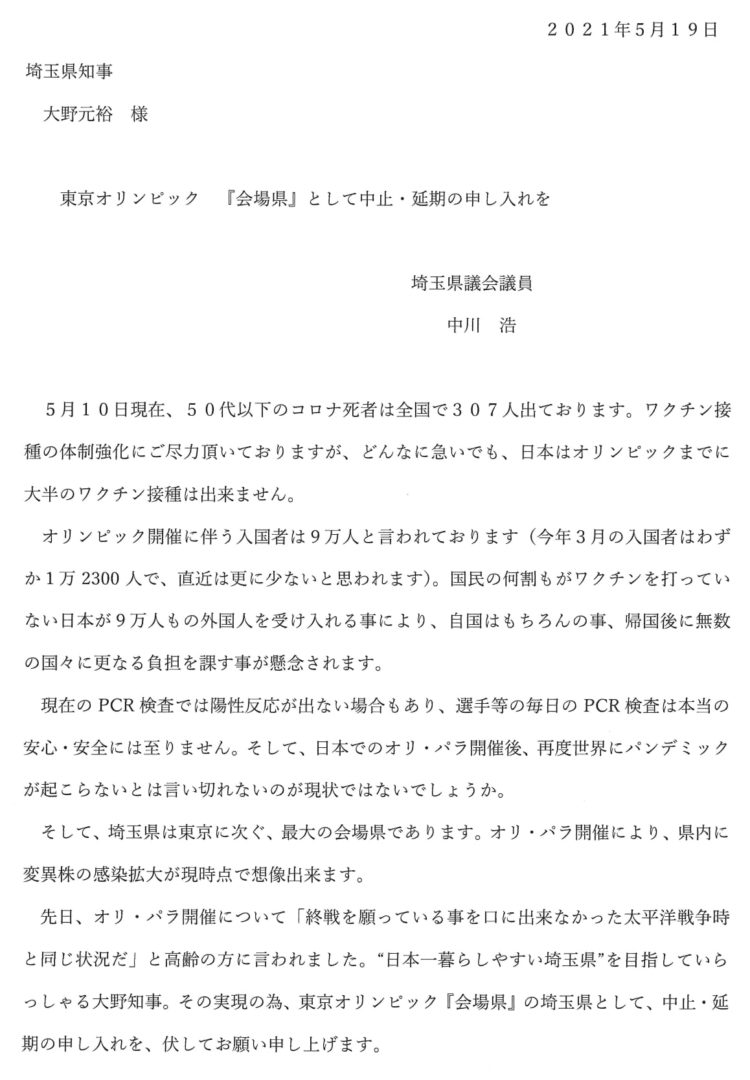 【東京オリンピックの中止・延期を】 埼玉県 大野知事に、私から5月19日に⇩以下の文書を提出致しました。国民・県民の多くがそう思っている事について、直接動いています。他の県議会議員や、報道の方などとも意見交換しています。インド型 変異株のウイルスが、海外渡航歴が周囲にも無い県民にも確認されるなど、ここ最近、情勢が変化して来ています。 唯一の“感染防止”策は、ワクチン接種と、人と関わる機会を『増やさない』事。 県民の命に、埼玉県庁は、責任があります。