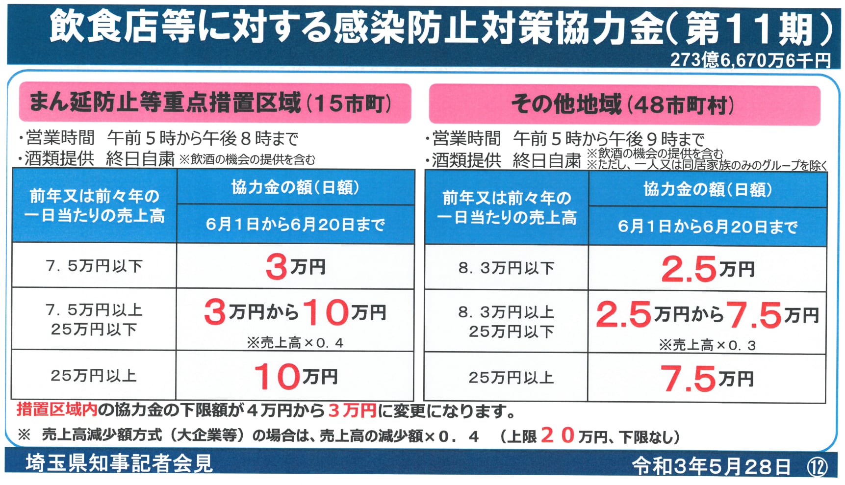 飲食店の方からお問い合わせ頂いている回答は、①県の認証制度を、狭山市などのまん延防止『措置区域以外』の地域でも申請できるよう拡大しますが、認証しなければ、時短協力金が得られない訳ではありません。