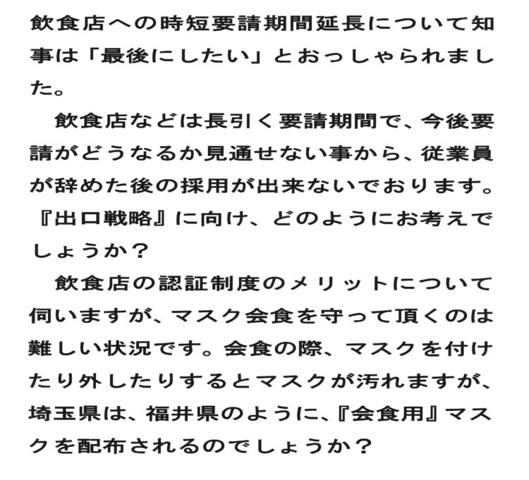 コロナ対策 市内の飲食店などからお話を伺った事をもとに、県議会で今日、知事に質問しました
