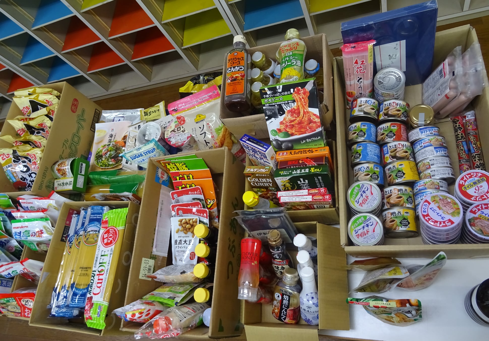 缶詰・レトルト・パスタ・食用油・調味料・即席味噌汁など。