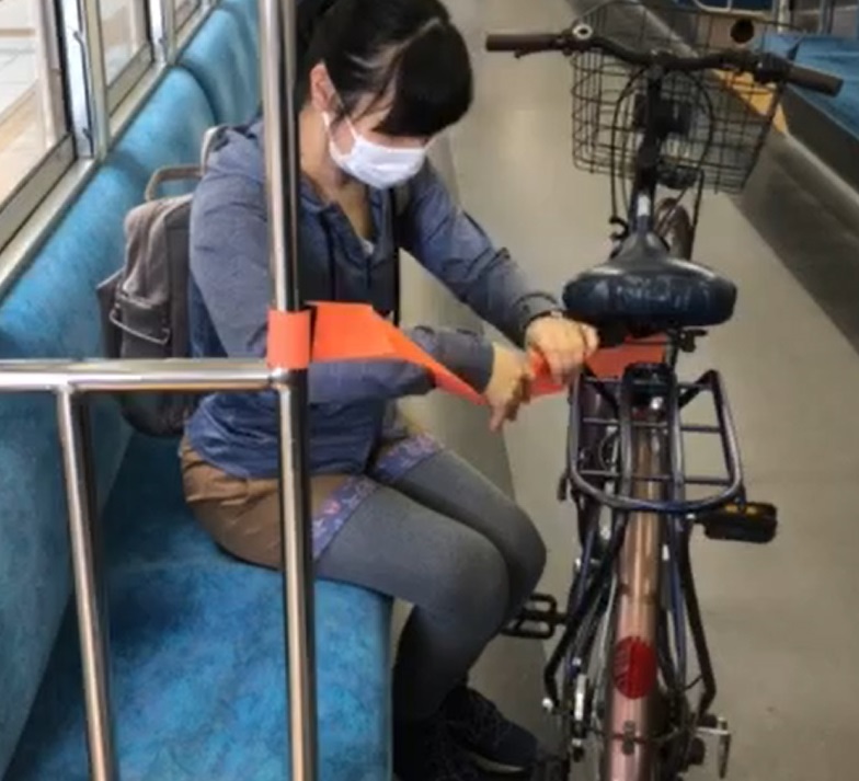 手すりに設置される固定ベルトで、自転車の転倒を防止するんですね。