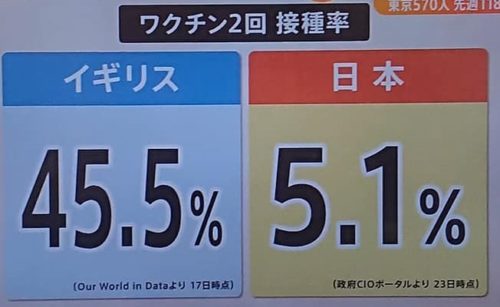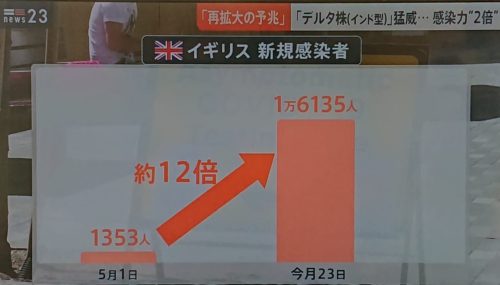 ワクチンの接種率 イギリスは日本の9倍で、感染者数は、5月1日時点に比べ12倍に増加。