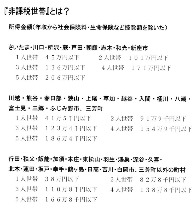 市町村によって住民税『非課税』の基準が違い、額面上の年収ではなく、年収から社会保険料・生命保険など控除額を除いた『所得金額』では、埼玉県は以下のようになっています。