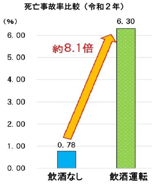 飲酒運転は、飲酒していない人と比べ、8倍の死亡事故リスクがあります。判断能力の低下が、思っている以上に著しいですね。