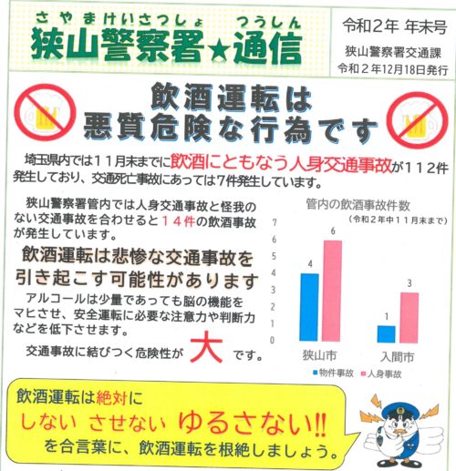 狭山市内での昨年1~11月の『飲酒運転事故』は10件。
