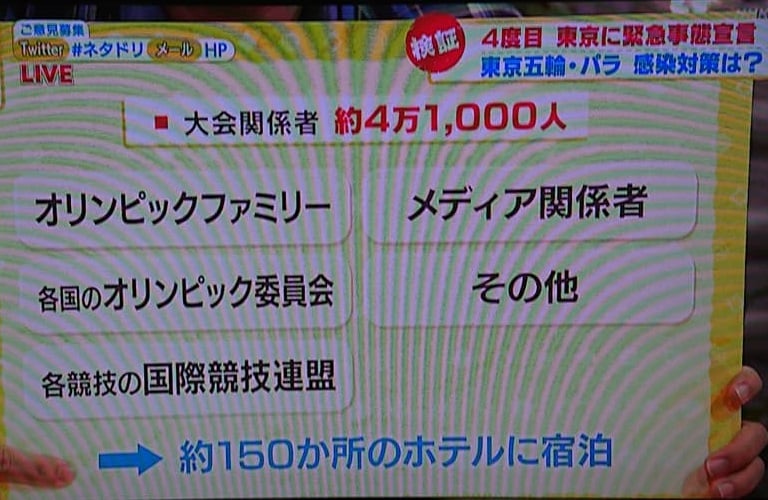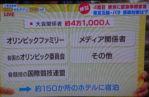 海外から続々入って来る時期になっても、ホテルには、先週の段階でも、大会関係者が海外から来る人なのかさえ、IOCは伝えていない事などから、ホテルが感染防止に困っている。