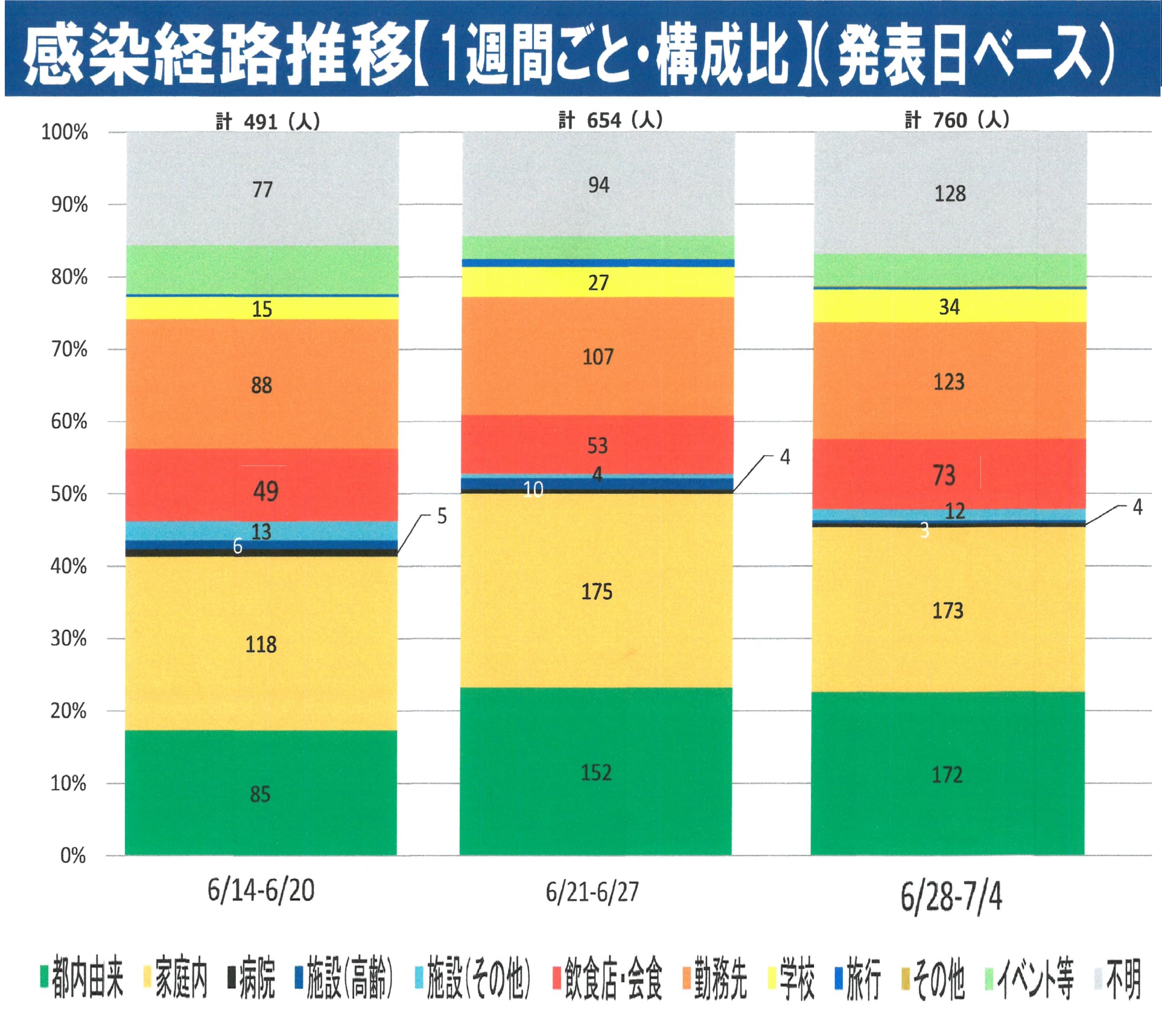 県議会で昨日私が質問したところ、知事から「飲食店で感染が疑われる割合は増加している」との回答だったので、担当管理職にデータ⇩を確認したところ、この2週間で、飲食店での感染が1.5倍に増えていました。