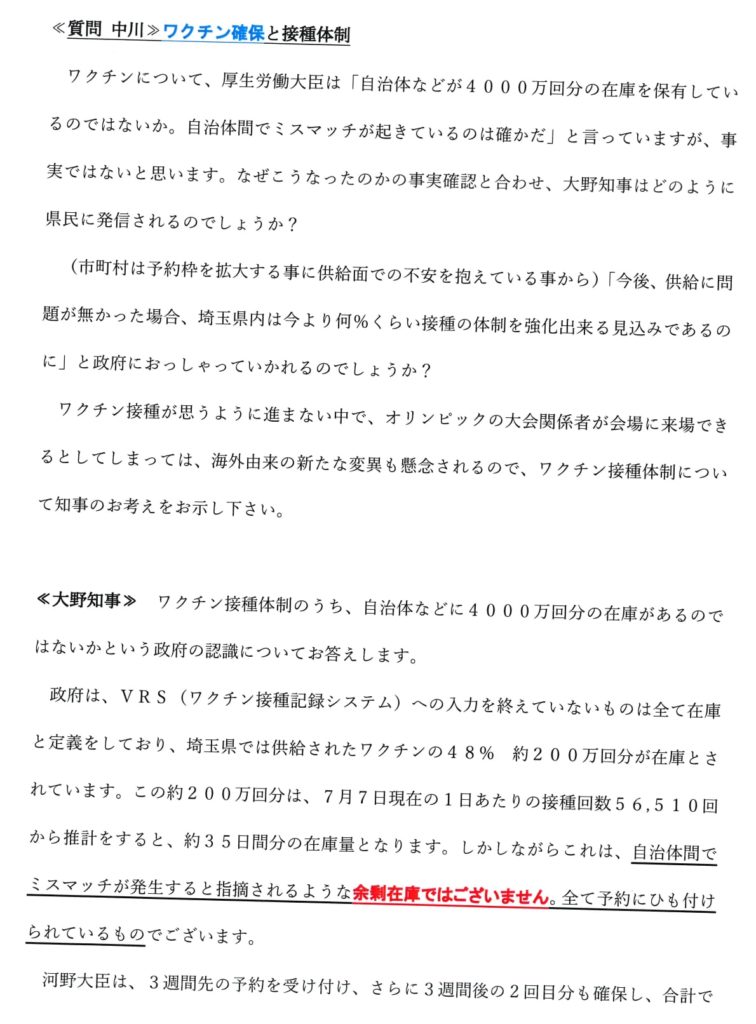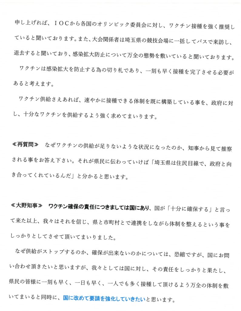 ≪再質問≫ なぜワクチンの供給が足りないような状況になったのか、知事から見て推察される事をお答え下さい。それが県民に伝わっていけば「埼玉県は住民目線で、政府と向き合ってくれているんだ」と分かると思います。
