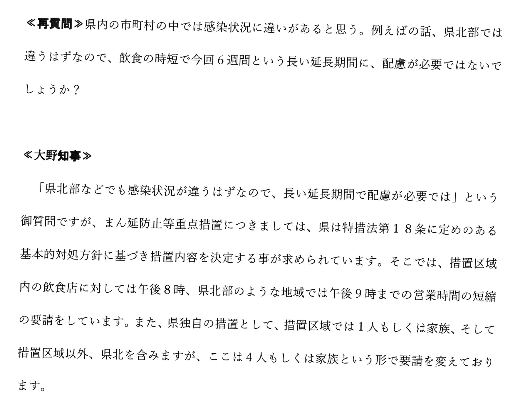 ≪大野知事≫ ワクチン確保の責任につきましては国にあり、国が「十分に確保する」と言って来た以上、我々はそれを信じ、県と市町村とで連携をしながら体制を整えるという事をしっかりとしてさせて頂いてまいりました。
