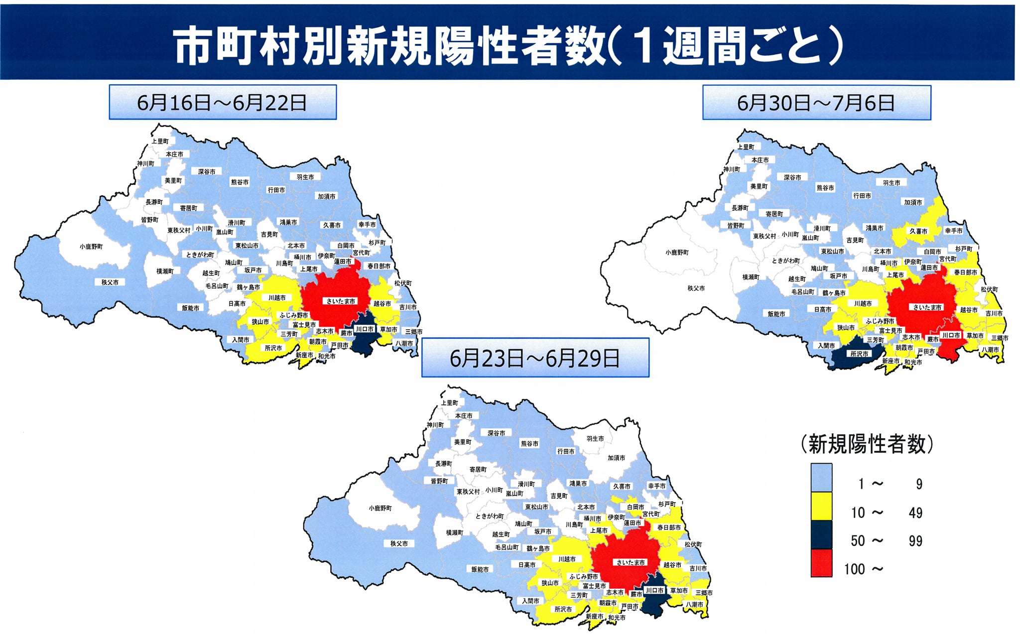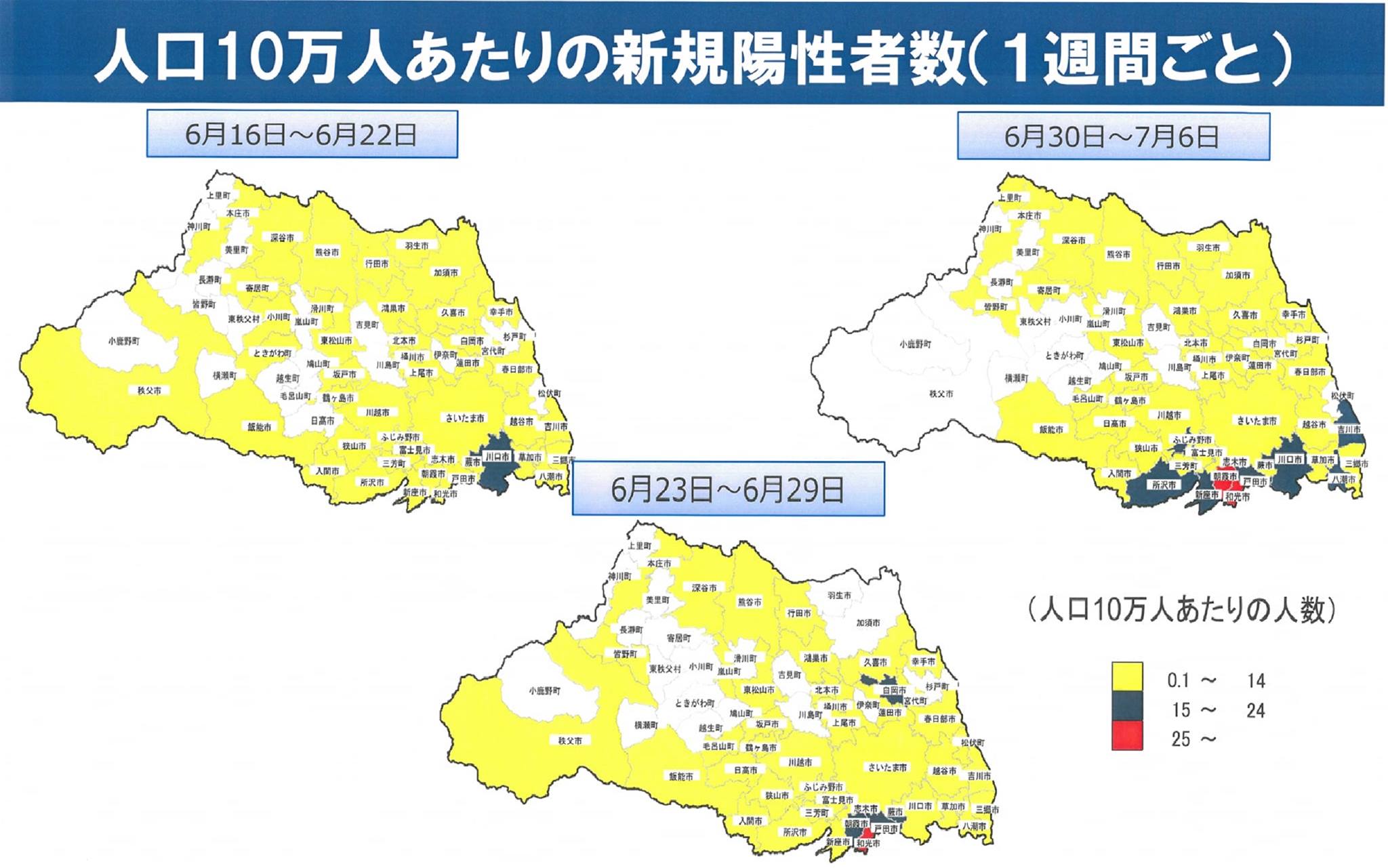 ⇩こちらの地図で、1週間 感染者がゼロな市町村が白色、黄色は9人以下しか出ていない市町村です。今回の時短要請は6週間、8月22日までという長い延長期間なので、配慮が必要だと思っています。埼玉県は広いので、さいたま市・川口市以外、全て同じ感染状況ではありませんし、皆さんのご協力のお陰で、感染者数が東京・神奈川に比べて埼玉県は少なく抑えられている事から、その事に対策で応える必要があると思っています。
