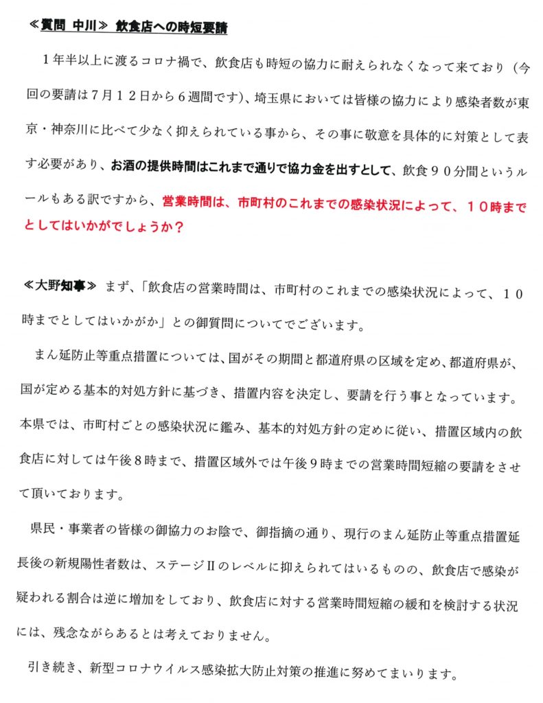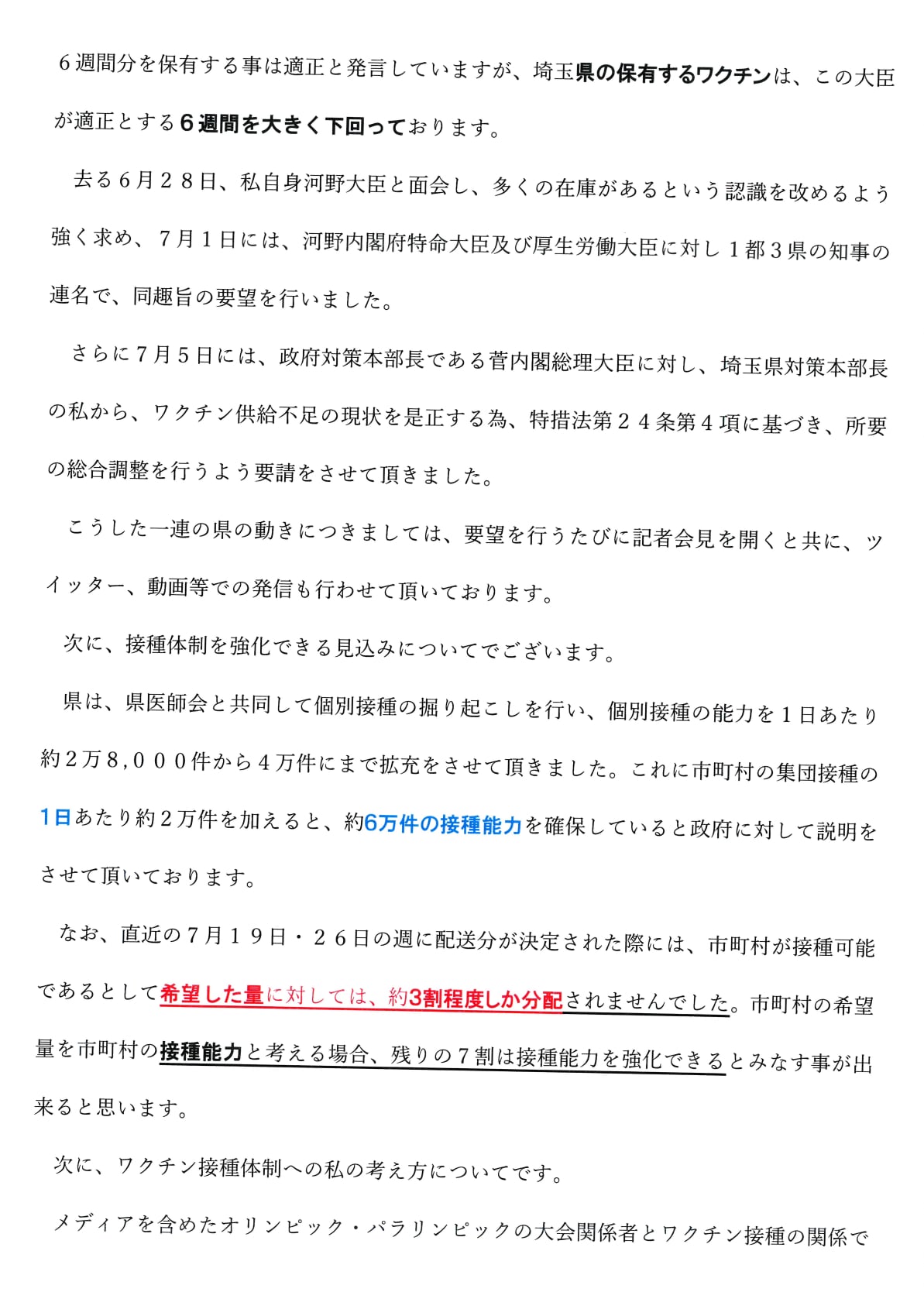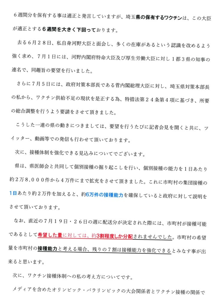 さらに7月5日には、政府対策本部長である菅内閣総理大臣に対し、埼玉県対策本部長の私から、ワクチン供給不足の現状を是正する為、特措法第24条第4項に基づき、所要の総合調整を行うよう要請をさせて頂きました。