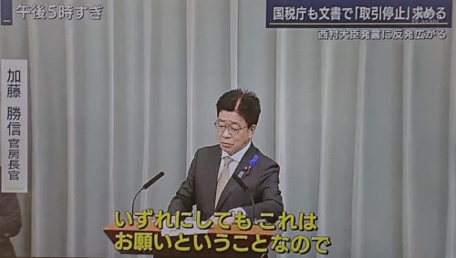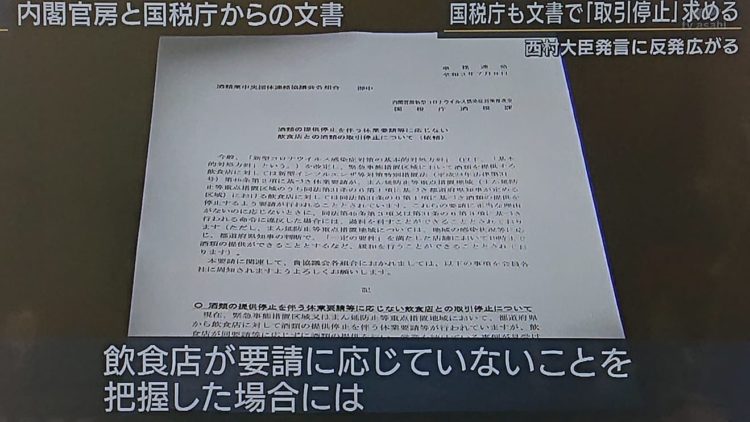 西村 経済再生担当大臣の発言「応じてもらえない店舗の情報を、関係省庁とも金融機関とも共有」。関係省庁には税務署を担当する『国税庁』も含まれる。