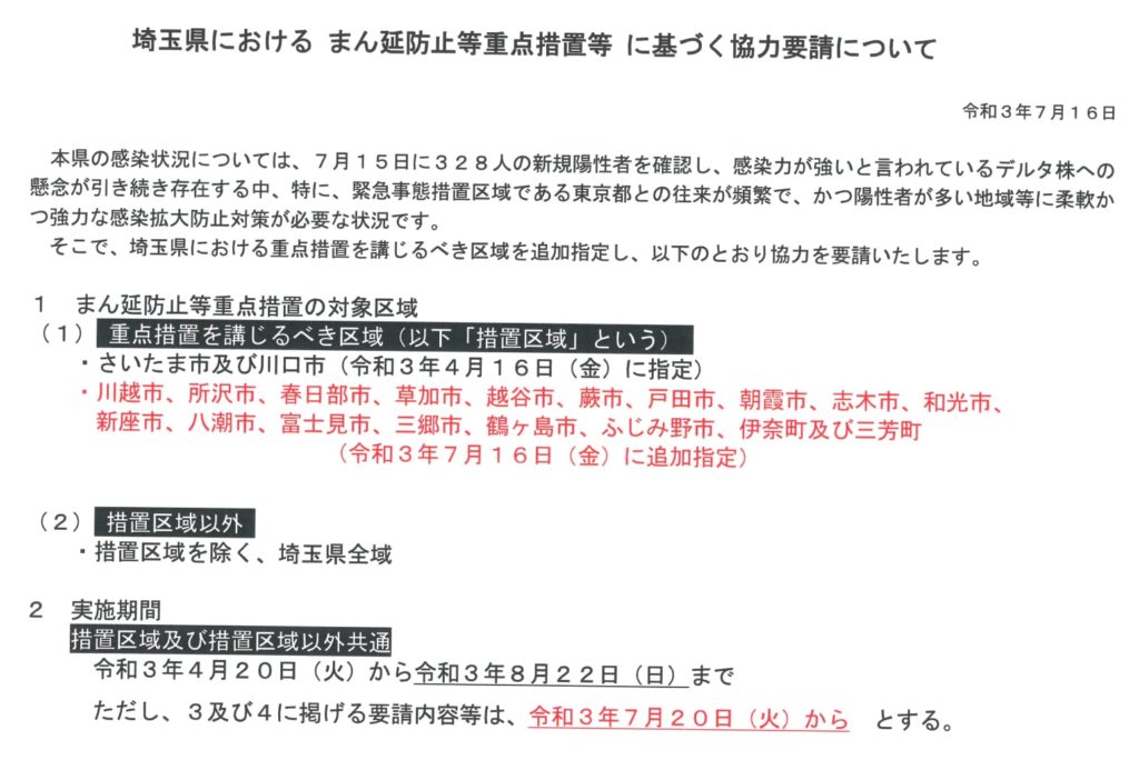 まん延防止等重点措置区域拡大へ/埼玉県―Yahoo!ニュース (7/19現在サイトは、削除されております。)