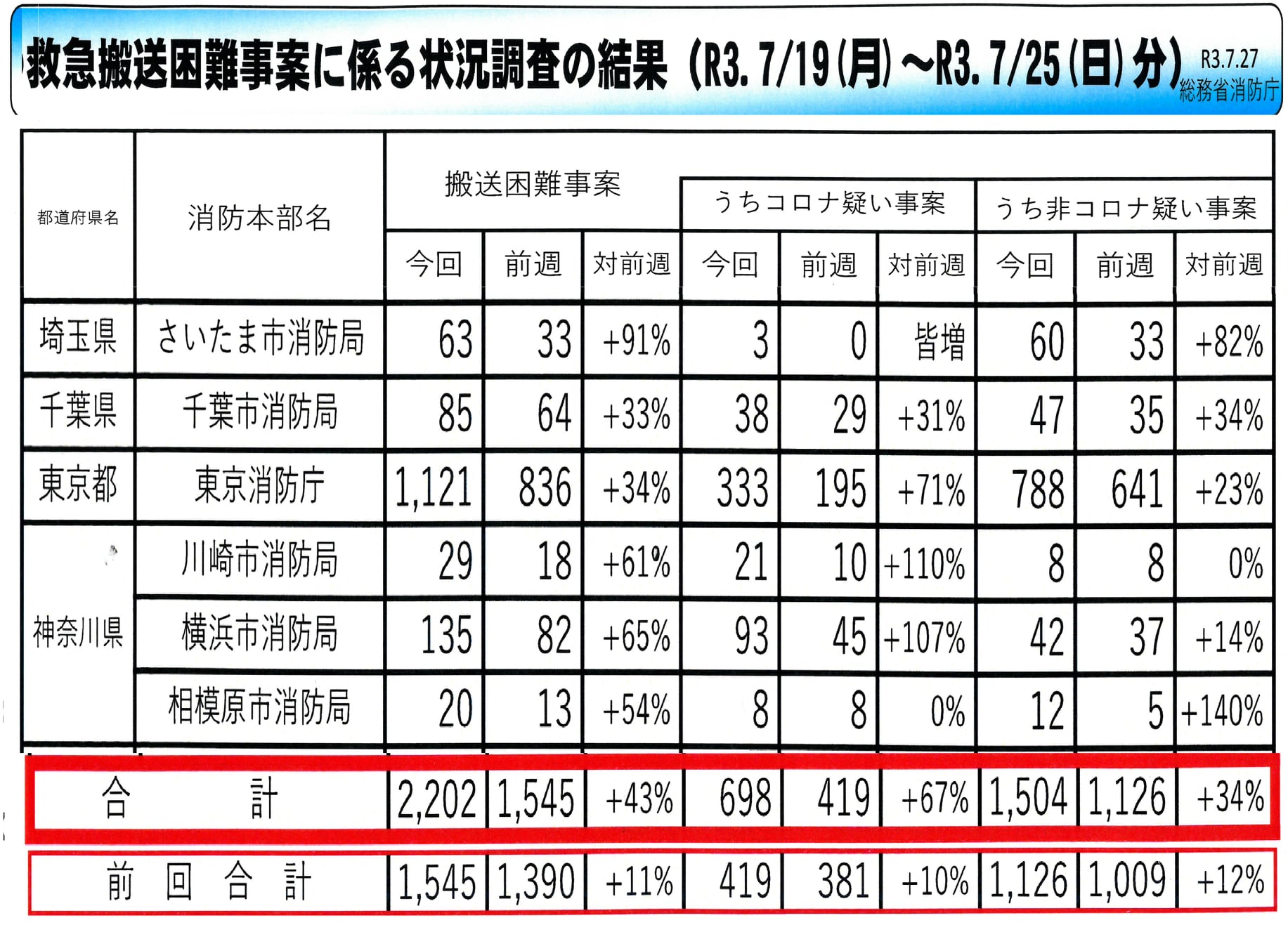 さいたま市の搬送困難状況は、前の週に比べ約2倍になっていますが、特色は、コロナ疑いの搬送困難ではなく、コロナと関係無い搬送の増加ですが、コロナ患者が増えると、他の医療に影響を与えます。一方、東京都内・横浜・川崎市のコロナ疑いの搬送が厳しい状況です。