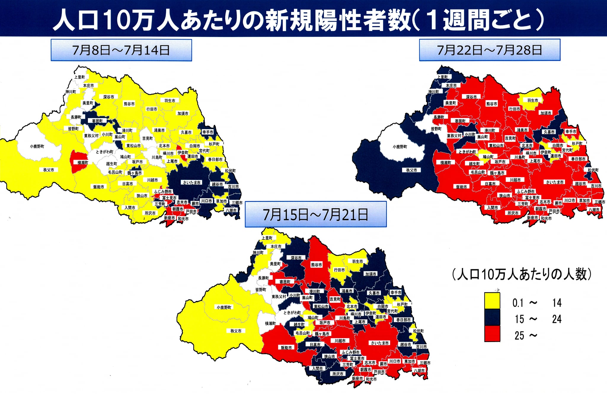 大野知事「埼玉県として、重症者数を減らす為に、早ければ明日(木)、3県で『緊急事態宣言』を国に要請する最終段階の調整をしており、8月22日までで、県内統一対象。 3県共同でPRしていく。 政府からは効果に懸念を示されている。 都知事との協議では措置内容を原則同じにしないと効果が無いという点で合意したとの事。 専門家会議で『コロナ以外の患者さんへの影響が出ている。 医療ひっ迫も近い』との指摘があった。