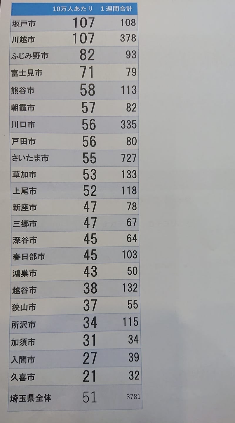 (県内人口10万人以上の市。小数点以下四捨五入し、1ケタで同数でも、上位から表示。出展:埼玉新聞)