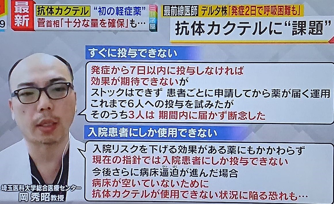 埼玉医大(川越) 岡秀昭教授「(首相の言う)抗体カクテル療法は、軽症〜中等症1の患者に、入院の早いタイミングで投与し、重症化と死亡を防ぐ為のもの。いま当院へ搬送される人の多くは中等症で、軽症や発症した早いうちは自宅療養せざるを得ない。運ばれてきたタイミングでは、カクテル療法は既に効果が得られる時間が過ぎている事が多い」