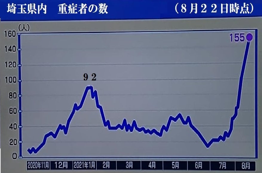 埼玉県の『重症者数』 1月のピーク(92人)と比べて考えると、現在は県内高齢者の85%がワクチン接種2回を終え、64才以下も11%が終えていて、この重症者数。64才以下が多いという事です。