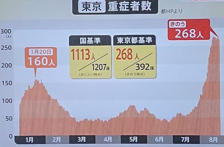全国の『重症者数』は1964人とされていますが、国の基準では本来、東京都の重症者数は1113人なので(都は「268人」だと言っている)、全国の重症数は、2809人となります。(24日現在)