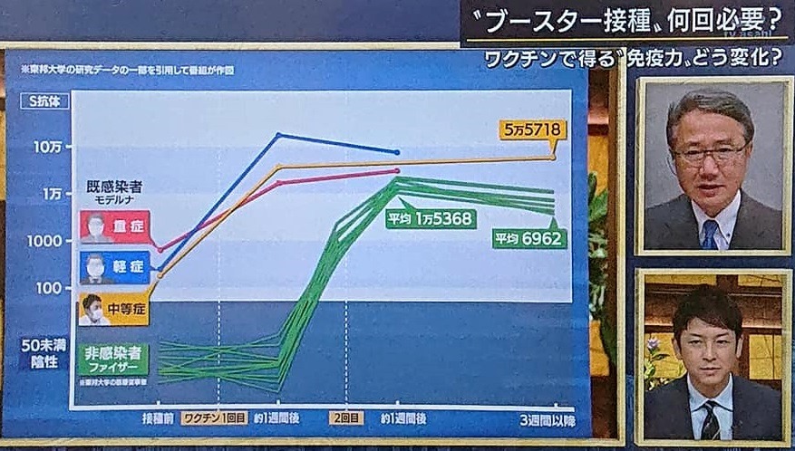 こちらは陽性になった方がワクチン接種した後、抗体(免疫)の変化。むしろ緑色の感染していない場合のほうをご覧下さい。 (写真はTV朝日)
