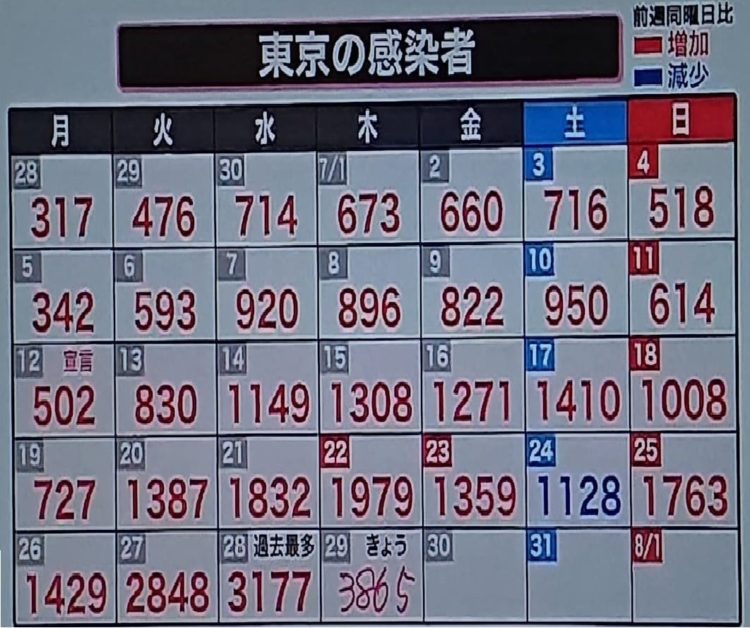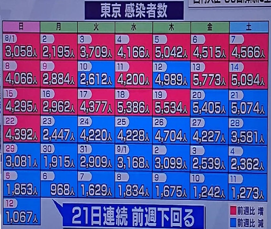 これほど分かりやすく出るとは。オリンピック閉会は8月8日でした(コロナは2週間後位まで影響が出ます)。そのようにTVなどが報じたのを私はまだ見ていませんが。