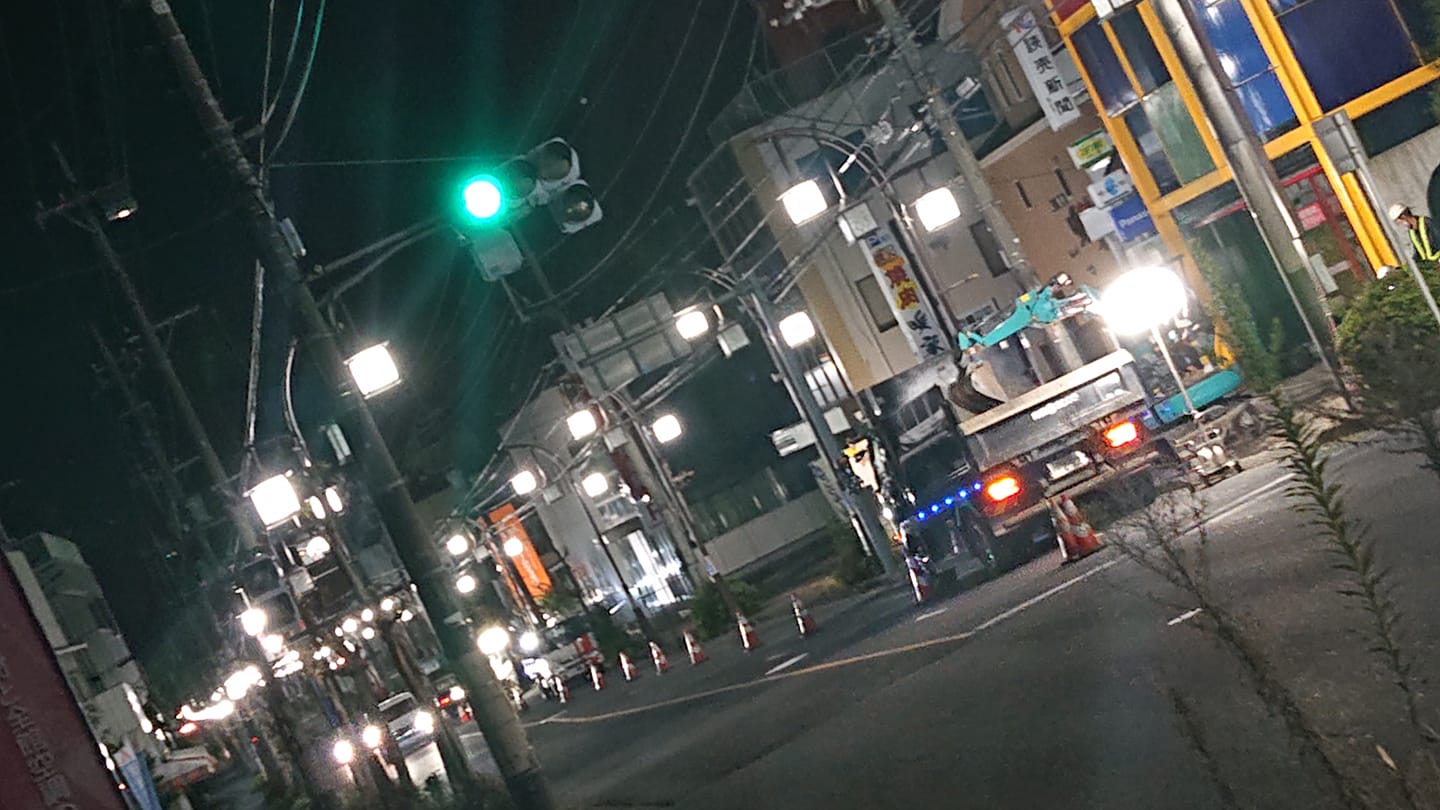 先日、工事の方が事務所にお見えになり、昼間だと道路が渋滞するので、大通りでは夜間工事にしたとの事。大きな影響が無いので、今回は皆さんに事前にお伝えしませんでした。