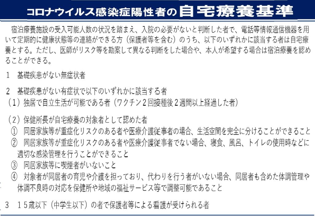 ワクチン接種が進んで来て、県でも1回目の接種の割合は既に5割を超え、重症化リスクが低下して来たので、これまで国の自宅療養基準よりも埼玉県はより厳しく、少ない自宅療養になるよう基準として来ましたが、これを国と合わせる。つまり、入院の必要が無いと判断した方で、以下の3つのいずれかに当てはまる方は、自宅療養。①基礎疾患が無く、症状も無い方。②基礎疾患が無く、症状があるが、家族等に感染リスクの低い方。③15才(中学生)以下で保護者の看護が受けられる方は、原則 自宅療養とする、国の基準と合わせる。