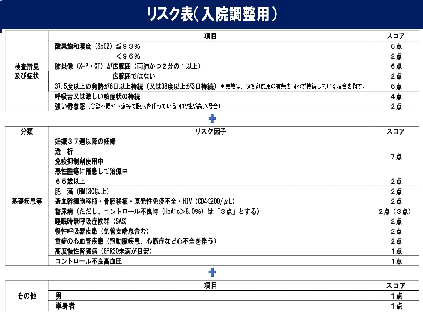 スコアの3点以上とは、複数の基礎疾患がある方、例えば慢性の呼吸疾患に、単身者等の1点が加算される方など。ただし点数に関わらず、医師が入院を必要と判断する場合には、点数に関係無く入院調整を行う対象となります。