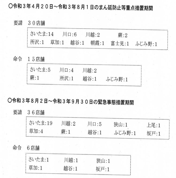 御協力頂けない場合には、事前に通知を行った上で、特措法に基づき、要請、そして命令を行う事になります。そしてこの命令に応じて頂けない場合には、地方裁判所に対して、過料事件通知を行う手続きになります。これまで、通知を行ったのは10店舗になりますが、9月22日に裁判所に確認したところ、まだ手続中で過料を科した実績は無いとの事でした。