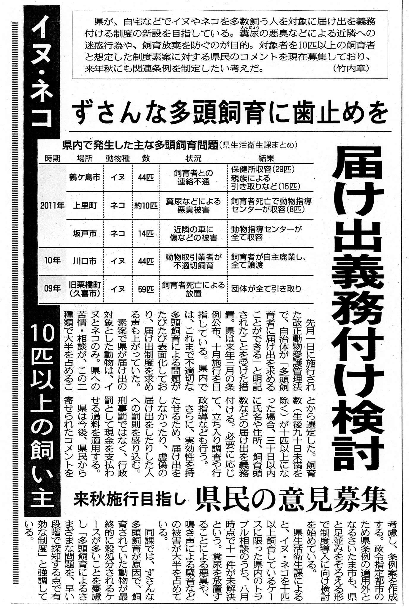 県内の多頭飼育崩壊 過去の記事一例