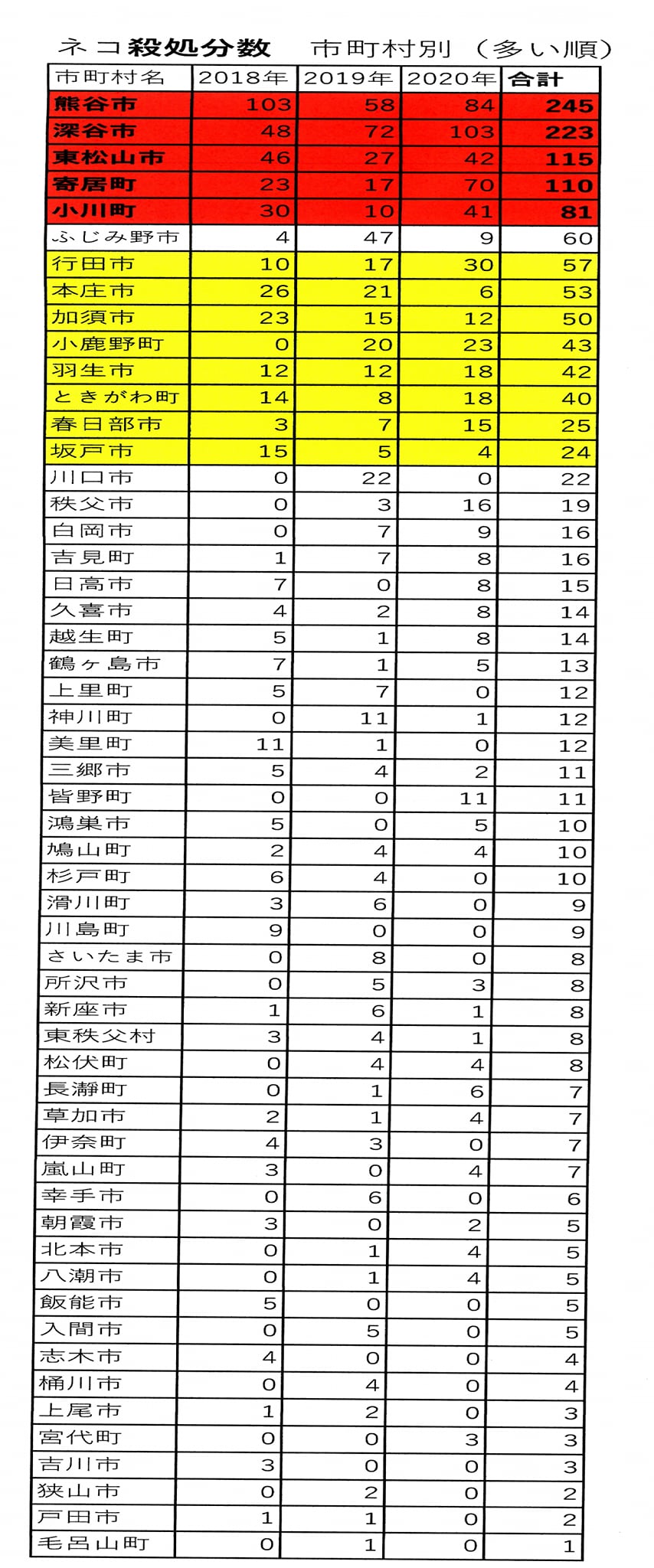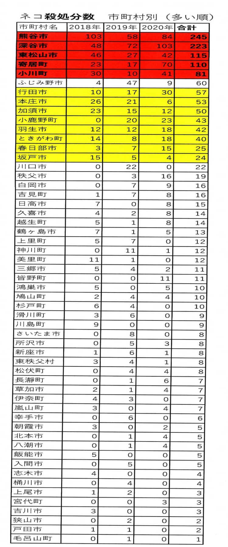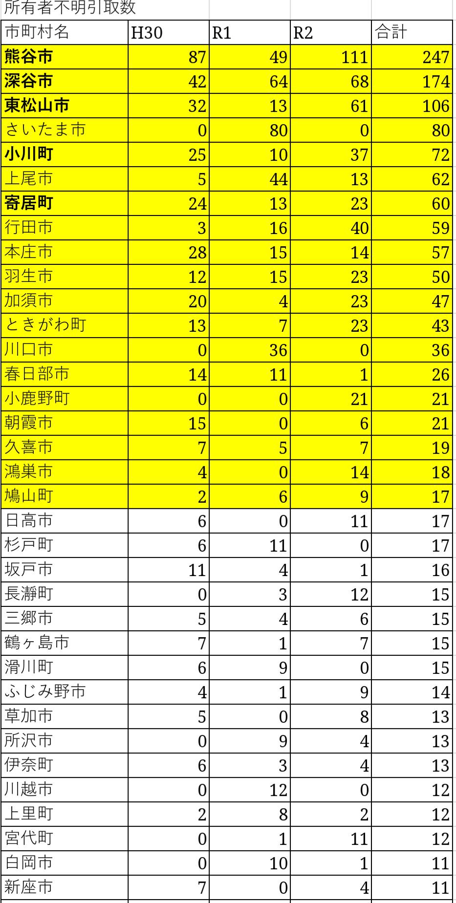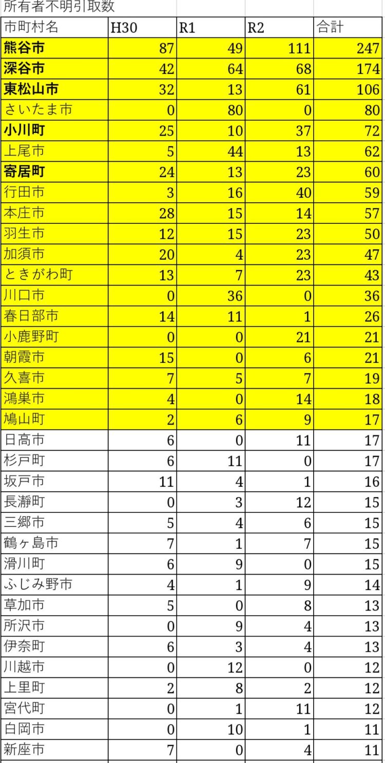(3つの表とも) 3年間 0だった市町村名は、書いていません。色付けしているのは、1年間だけ多かった所(例えば ふじみ野市)を除いて、多い市町村です。