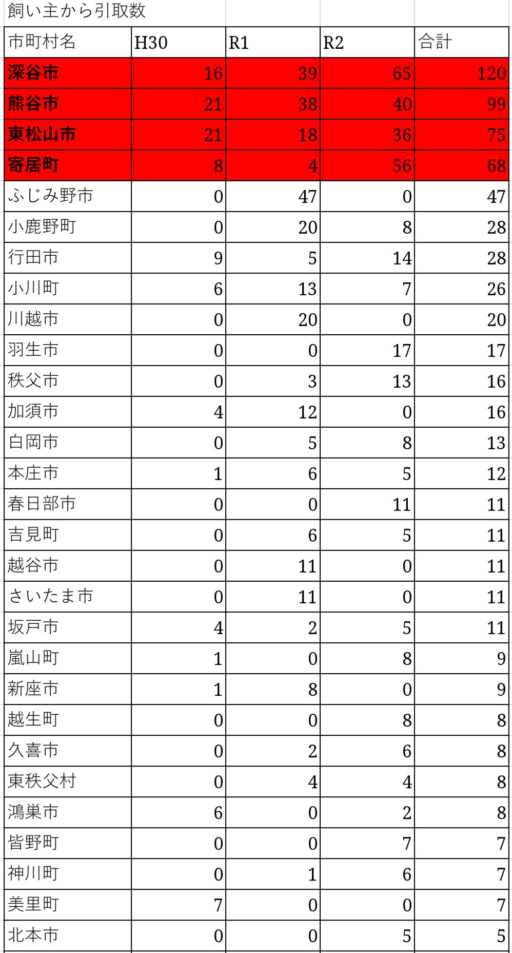 『飼い主から引き取りの申し出があった市町村別 数』で、最近3年間で合計50匹以上だった4市を、別の表でも太字にしており、市町村の力が必要だとデータでも痛感するところです。