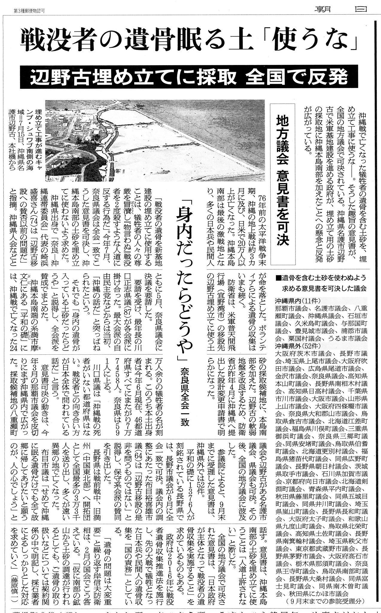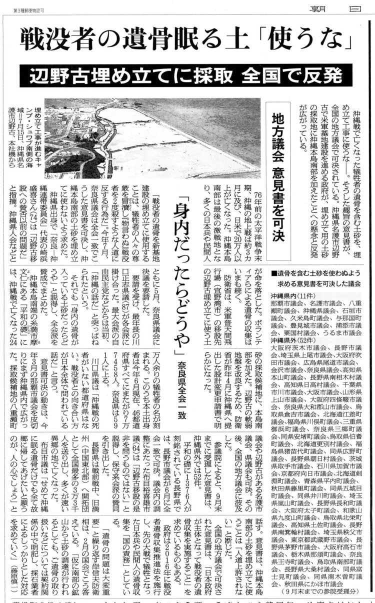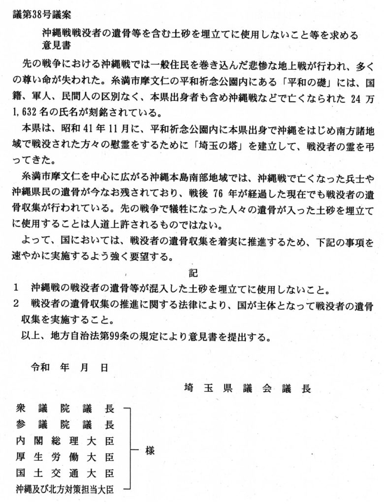 太平洋戦争の際、沖縄戦で亡くなった方の遺骨が埋まった土砂を、埋め立て工事の為の土砂として使わない事を政府に求める埼玉県議会での議案が、どの政党も『全員賛成』で可決されました。私が提案した訳ではありませんが、6月議会からその必要性を求めておりました(沖縄県議会以外で奈良県に次いで全国2県目かと)。