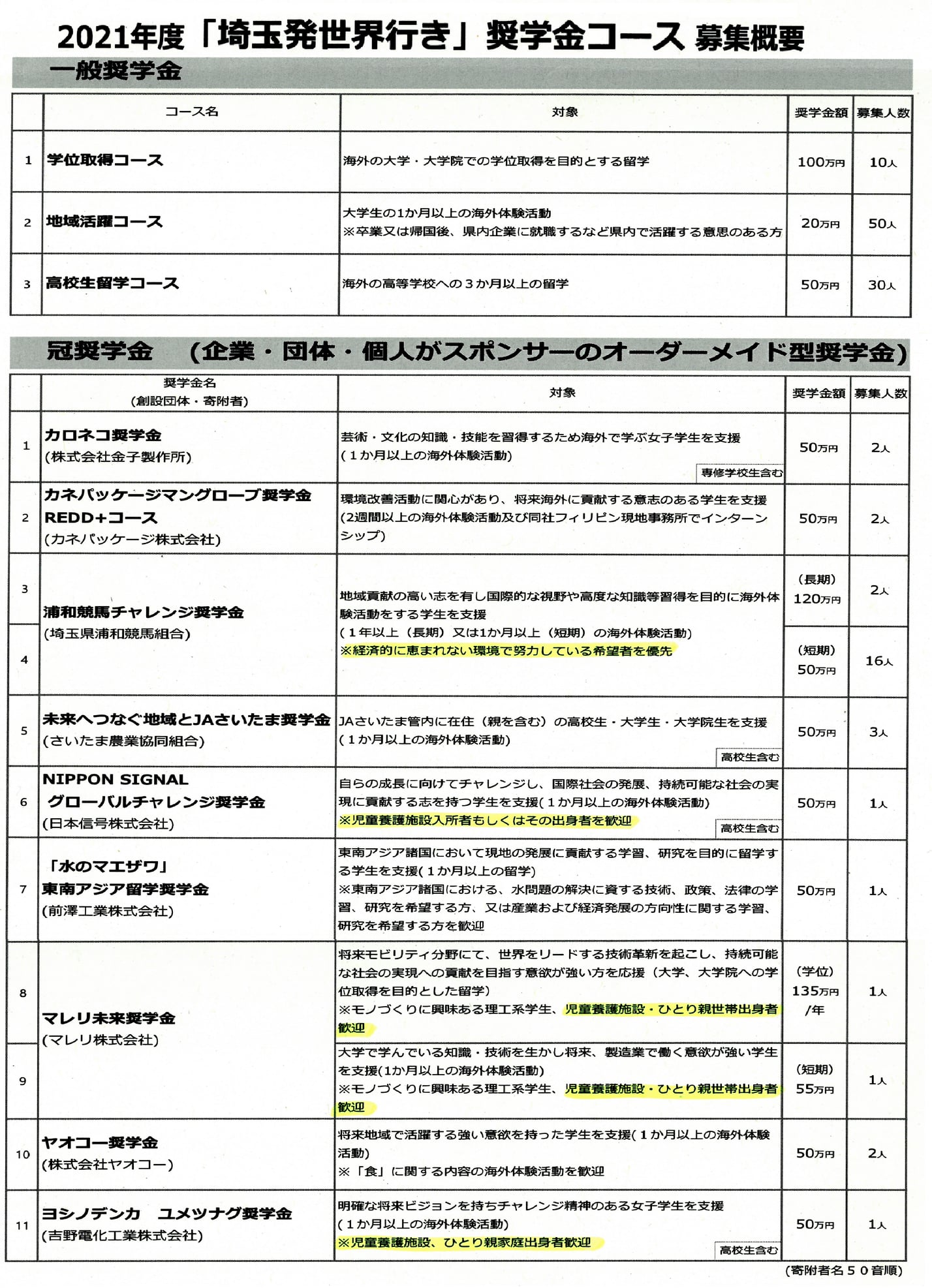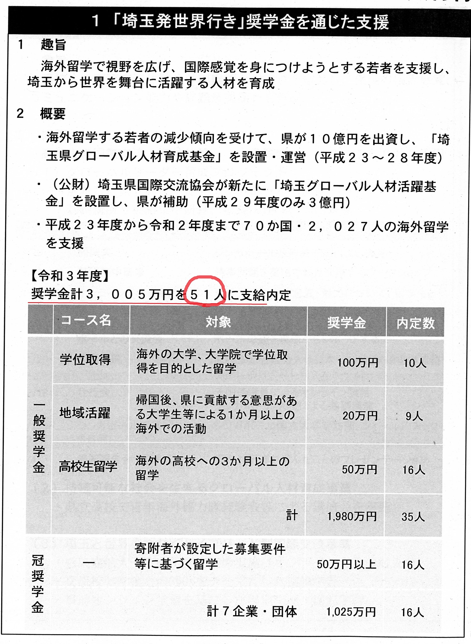 県庁が窓口になり、企業・事業所・個人からの寄附により海外留学の奨学金を給付する制度があり、「埼玉から国際人を」的に『政治家受け』はするかも知れませんが、所得の再分配がうまくいっていない中、留学はおろか、高校卒業後の『進学』さえお金が大変です。そこで、