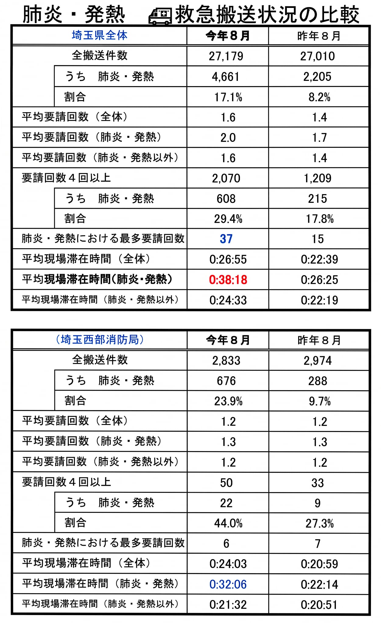 今年8月、県全体で救急車が現場に留まった平均は38分。
