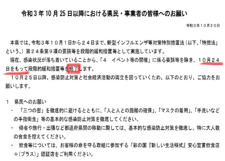 飲食店への時短要請 25日【全面解除】が正式に埼玉県で決定しました。カラオケも。人数制限も撤廃。