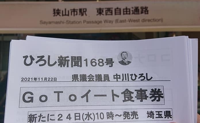 埼玉県の『GoToイート食事券』が新たに発売される事が、発売日直前に発表され、『ひろし新聞』168号を緊急発行。仲間と配布しています(私の場合は3時間睡眠。昨夜から急に寒くなりましたね。お気を付けて)。
