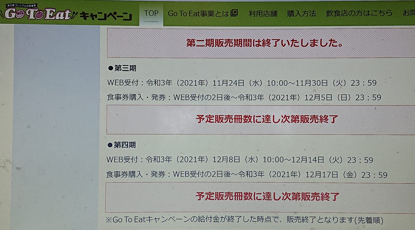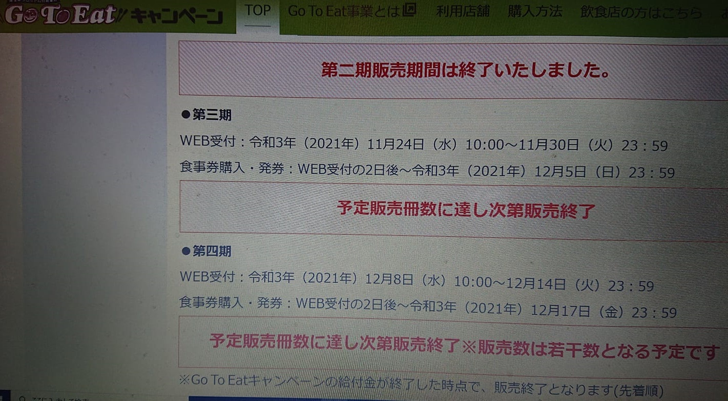 『GoToイート食事券』の県庁HP⇩を見ると、12月8日に第4期として新たに発売される分があるかのように思ってしまいますが、次回発売されるのは、新規発売分は無く、今回の発売で ネット申し込みしたものの購入しなかった残り分だけの発売になる(第3期が売れ残ればその分も となりますが、そうならないと思います)ので、HP原稿の変更を提案しています。