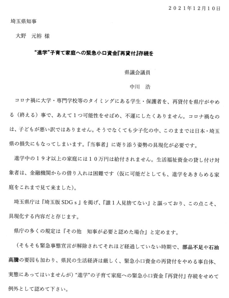コロナ禍の困窮家庭の為に、市町村 社会福祉協議会で緊急小口資金という貸付制度があり、貸付が不充分な家庭には『再貸付』という制度があるのですが、今月でそれを県庁が取りやめるという議案が来週(火)に県議会に出されようとしています。