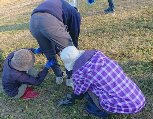 作業終了後、若い参加者のズボンにくっついた種を、お姉さま方が2人掛かりで取っているところ。