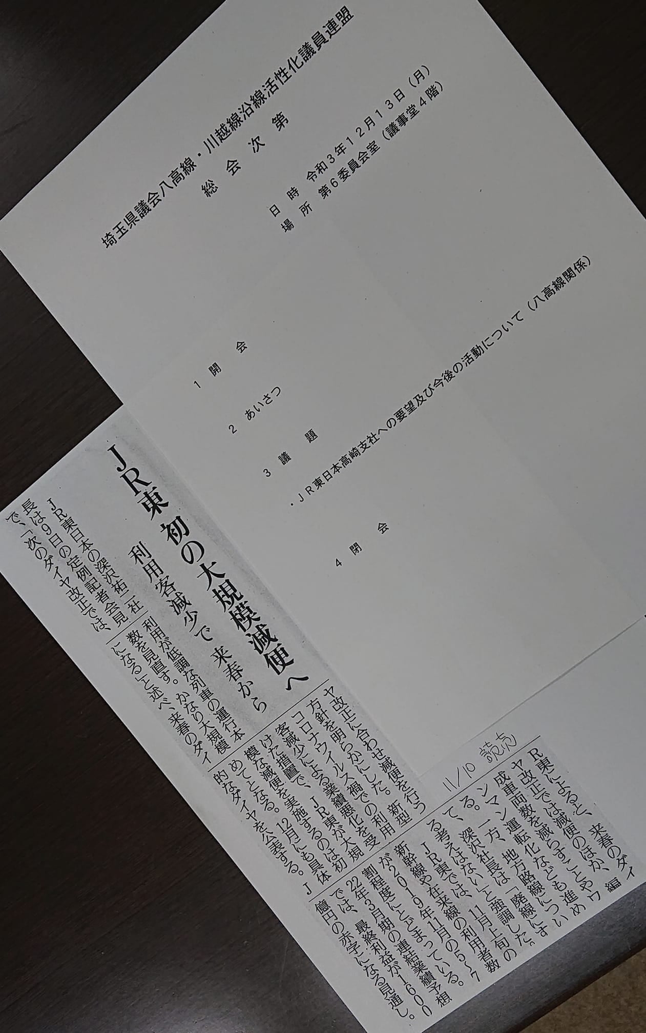 八高線 川越線の議員連盟 会議があり、予定していた議題に加えて【JR大幅減便】について私が問題提起した報道資料を配って下さり、小谷野五雄会長(日高市)が私に発言を促してくれました。皆さんに感謝