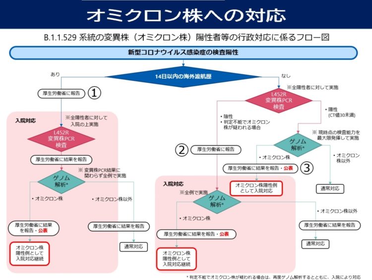 (更に詳しく書きますと)ゲノム解析は、『デルタ変異株PCR』検査を行い、デルタ検査で陽性であればデルタ確定となり、陰性だとオミクロン株の疑いになるとの事。県の衛生研究所で検査しています。