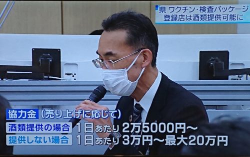 たとえば、①今報道されている『認証店』。コロナ禍が2年にもなっている中だと移転するお店などもあり、認証を取り直さなければならない事が知られておりません。認証を取ろうとしても10日ほど待たされる事があり、その間の協力金は認証後、さかのぼれる様にしないのか?②認証の後でないと『ワクチン検査パッケージ』の申請が出来ない事になっていますが、セットで申請出来ないか。打合せしています。『ワクチン・検査パッケージ』の適用で8時半までお酒提供を認めるのなら、制度の不備で、民間が不利益にならぬよう。 (県庁に検討してもらっており、結果が出次第更新します)
