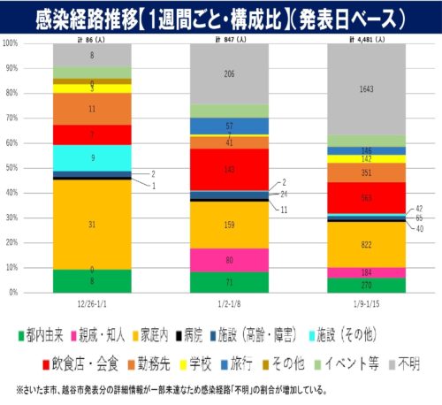 『感染経路不明(グレー色)』が埼玉県で半数近くに増えていっている中、対策のエビデンス(科学的根拠)が問われてしまいます。