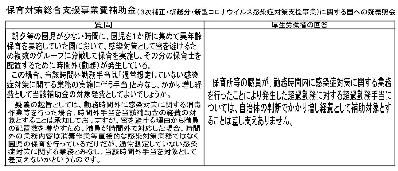 市内保育園の先生から「早朝保育や時間外保育の時間、これまでやむを得ず異年令の子どもと一緒の保育になってしまっており、人件費が払えれば、年齢を分けて保育し、感染防止したい」とお話があり、市役所と連携しつつ、県庁に提案したところ、国と話してくれて、補助金を人件費にあてていい事になりました(感謝)。